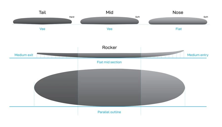 – Die halbrunde Nase mit niedrigem Einstiegs-Rocker-Design