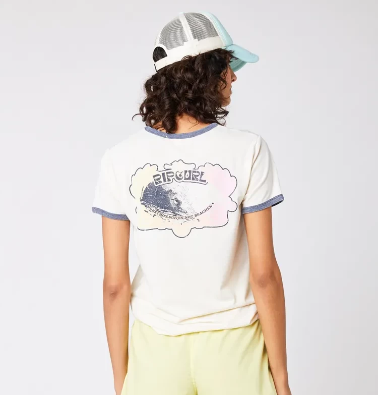 Das weit geschnittene Ringer Surf Revival T-Shirt für Damen präsentiert sich in einem lässigen Stil für optimalen Komfort den ganzen Tag. Der große Print auf dem Rücken besticht durch einen unglaublich modischen Retrostil. Die kontrastierenden Ärmelnähte sind das i-Tüpfelchen. Lassen Sie sich dieses T-Shirt keinesfalls entgehen!