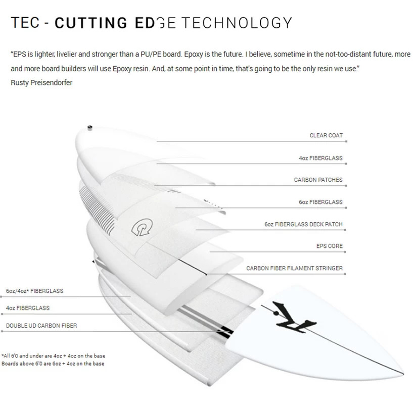 Torq Epoxy Composite bietet leistungsstarke Shapes in unserem hochmodernen Epoxy-Layup. Diese Boards bieten die beste Balance zwischen Leichtigkeit und Haltbarkeit. Mit unserem eigenen, einzigartigen Laminierungsprozess sind wir in der Lage, ein sehr starkes Glasfaser-Layup aus 6oz und 4oz in einem dreilagigen Deck und einem zweilagigen Belag (mit einer vierlagigen Railüberlappung) mit einem hochdichten EPS-Schaum zu verwenden und trotzdem ein Boardgewicht zu erreichen, das einem leichten Glasfaser-Layup entspricht.